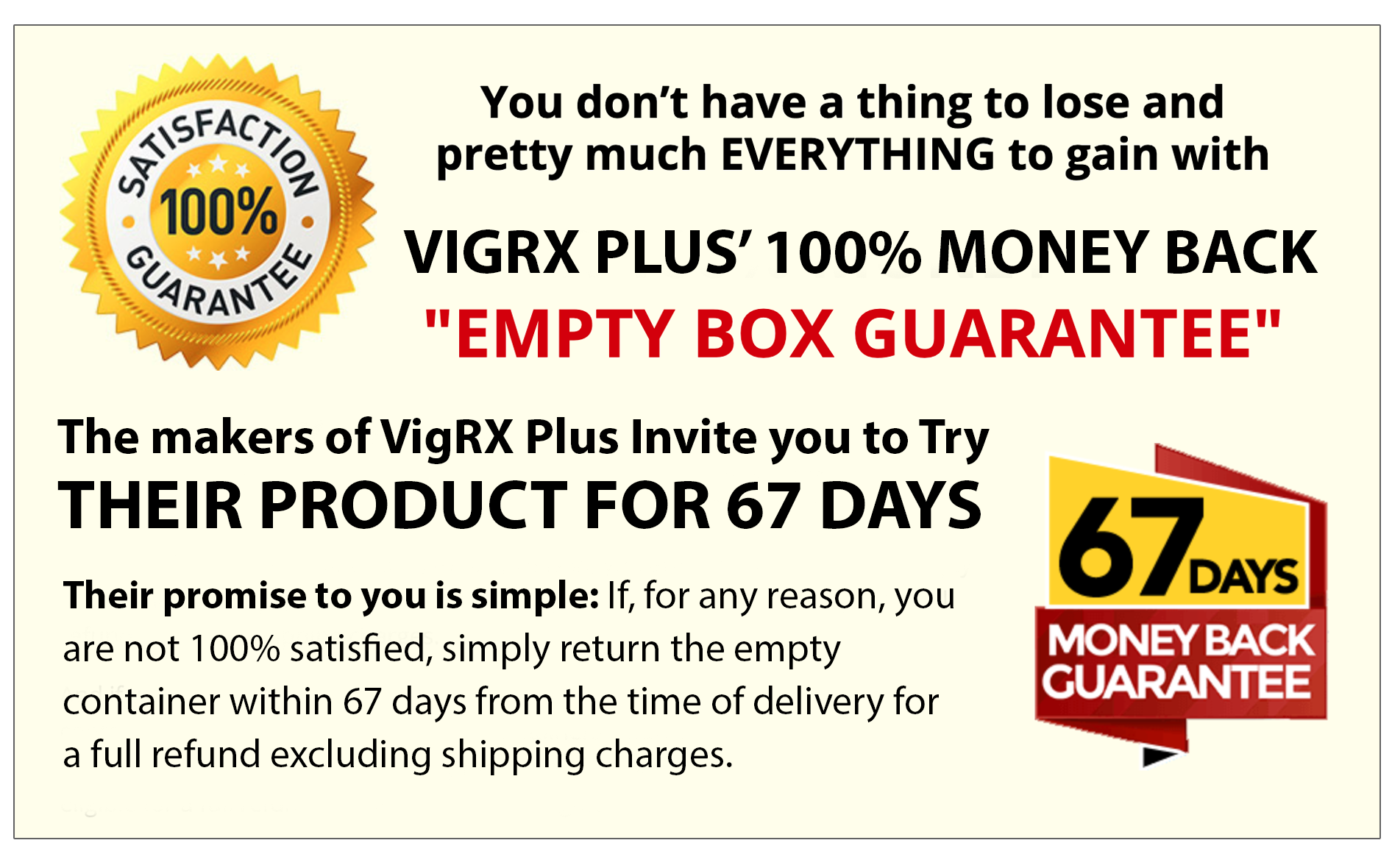 Finally, VigRX Plus comes with excellent value, including Free Shipping and Bonus products, including a bottle of Semenax climax enhancer, on select packages. Plus, the maker of VigRX Plus is so confident with its product that it backs all purchases with a 67 Day "Empty Box" Money Back Guarantee.1